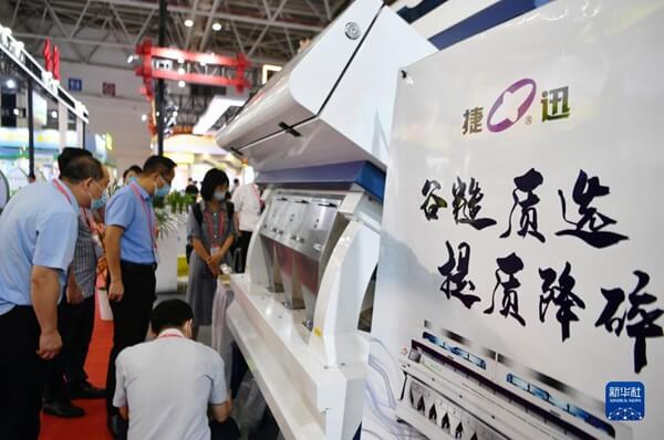6月18日,在粮油产品及设备技术展区,参展商展示智能云大米精选机。