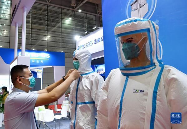 6月18日,工作人员在第二十届中国·海峡创新项目成果交易会上整理展示的医用正压防护服。新华社记者魏培全 摄