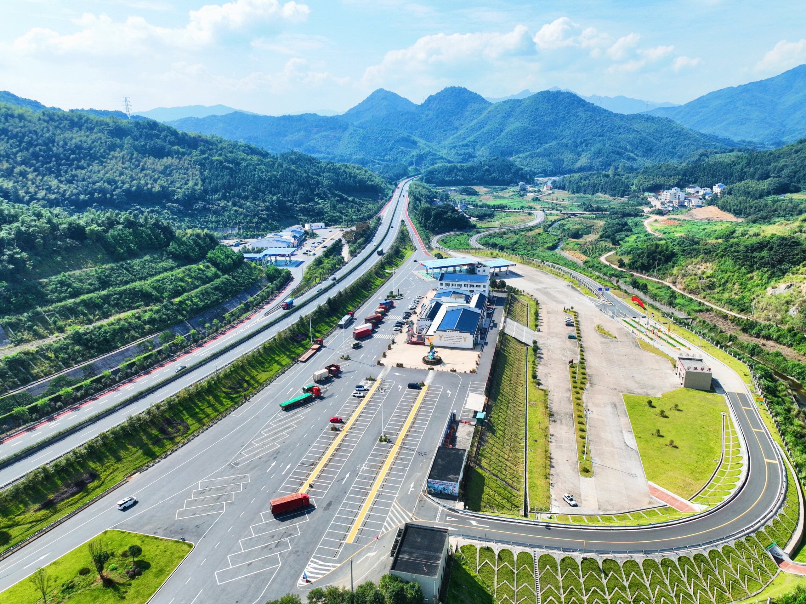改造后的林厝服务区,建筑外观融入畲族传统民居特色,以青瓦、木构、彩绘为元素,营造出浓郁的民族风情氛围。服务区内设有丰富的商业业态,充分满足旅客多元需求。其中,地方特产展销区集中展示了宁德大黄鱼、古田银耳、福鼎白茶等地理标志产品,成为推广闽东物产的重要平台;美食餐饮区则引入了畲家乌米饭、菅叶粽等特色小吃,配合知名连锁餐饮品牌德克士,为过往司乘提供多样化的饮食选择。此外,服务区还配备了智能充电桩、星级卫生间、母婴室、第三卫生间等现代化服务设施,为长途货运司机提供舒适的休息空间,体现了浓厚的人文关怀。