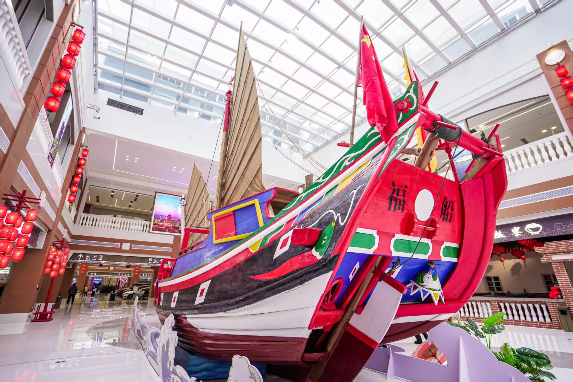 服务区以“宋元传福·丝路驿站”为主题,融合闽南骑楼建筑、文化长廊与农业景观,打造传统文化与现代科技交融的文化体验空间,涵盖蟳埔簪花、南音展演、VR体验馆和数字娱乐等项目。业态布局突出“服务区+文旅+商贸”多元融合,引入麦当劳、星巴克、驿佳购便利店、进口商品馆、闽台馆、服装特卖店及全省首家服务区主题影院——万星几何影城等多项经营业态。公共服务配备“5+1”综合服务中心(党群服务中心、军人驿站、司机之家、自驾游驿站、ETC服务中心,警务工作服务站),并设第三卫生间、母婴室等人性化服务设施。通过智慧化管理平台,集成安防保护、信息化查询、智慧导游等功能,提升服务效率。
