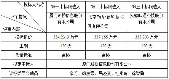 现将上述中标候选人、定标结果及部分投标人废标原因予以公示,公示时间: 2018年4 月 23日至 2018年 4 月 26日。投标人对评标结果有异议的,应在公示期间书面向招标人提出。(评标结果公示期满后无异议的,本公示自动转为中标结果公告)厦门路桥信息股份有限公司即为中标人,招标人将签发中标通知书。