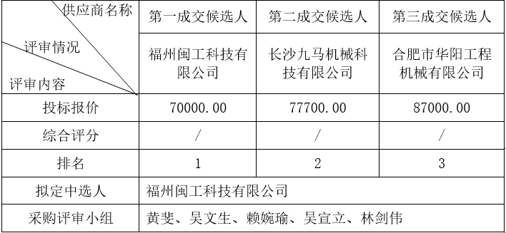 福建省泉州高速公路有限公司小型机具设备采购项目询价结果公示 文章来源: 发布时间: 2025-11-12 11:24 星期三 阅读次数: 278福建省泉州高速公路有限公司小型机具设备采购项目询价结果公示:小型机具设备采购项目于2025年11月10日上午10点进行了评审,现将成交候选人及评审结果公示如下:部分供应商报价无效或资格后审不合格原因:无。现将上述成交候选人等情况予以公示,公示时间:2025年11月12日至2025年11月17日。如对询价结果有异议的,应在公示期间书面向采购人提出。询价结果公示期满后无异议的,本公示自动转为成交结果公告。 福州闽工科技有限公司即为成交供应商,采购人将签发《成交通知书》。 采购人:福建省泉州高速公路有限公司 2025年11月12日上一篇: 沈海高速池店出入口服务区(含加油站)项目设计服务竞争性磋商公告下一篇: 大往服务区AB区自营餐饮服务团队采购招标公告