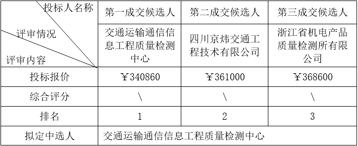 现将上述成交候选人、定标结果及部分投标人废标原因等情况予以公示,公示时间:2025年11月21日至 2025 年 11月25 日。投标人对询价结果有异议的,应在公示期间书面向采购人提出。询价结果公示期满后无异议的,本公示自动转为中标结果公告。 交通运输通信信息工程质量检测中心 即为中选人,采购人将签发《成交通知书》。
