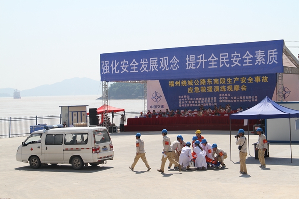 【福州东南绕城高速公路有限公司】在绕城公路东南段施工现场举办生产安全事故应急救援演练观摩会。本次演练模拟索塔爬模在爬升过程中发生局部偏移倾斜,导致操作平台上的套筒掉落砸中下面违规在禁区作业的作业人员为课题。接到事故报警后,在地方政府的统一指挥下,市高指、项目公司、监理单位立即启动应急预案,成立指挥部,应急救援组、医疗救护组、专家组、警戒组各司其职,在最短时间完成救援任务,有效检验了项目业主、监理单位、施工单位应急体系的衔接。(福泉公司、泉厦分公司、福州东南绕城高速公路公司)