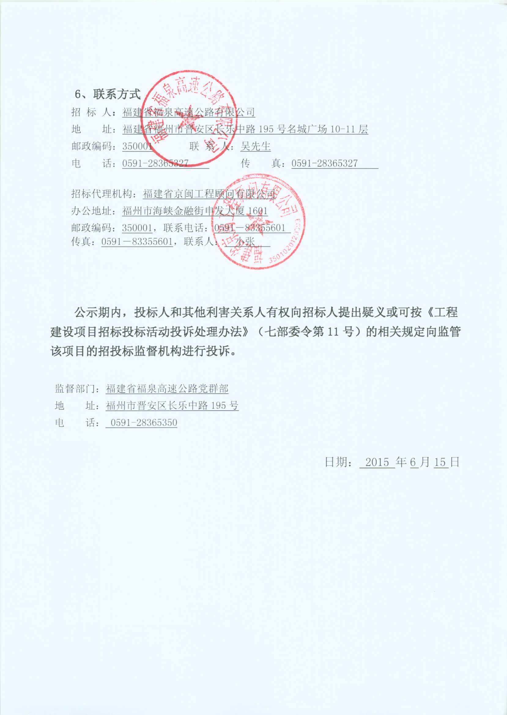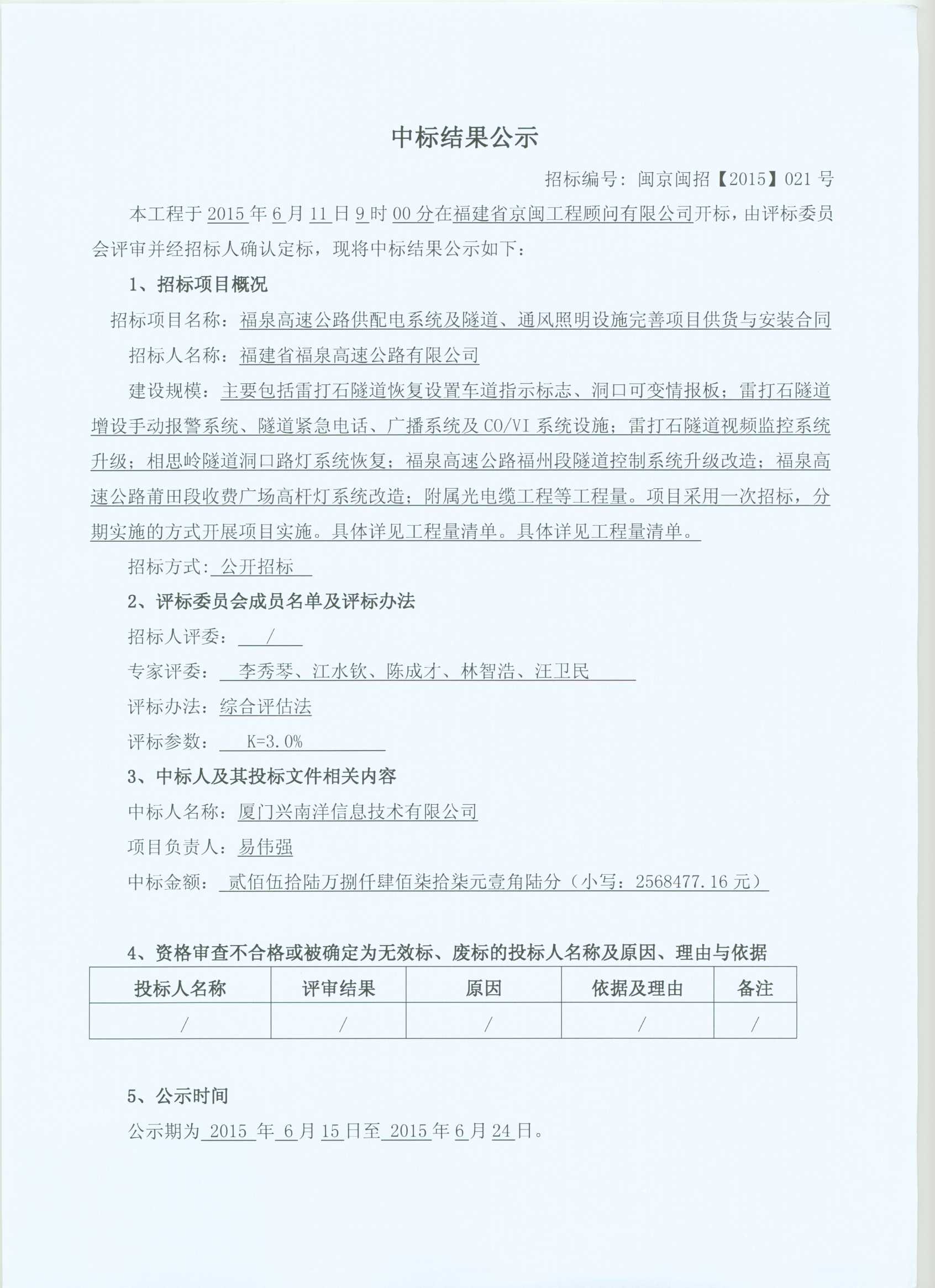 福泉高速公路供配电系统及隧道通风、照明设施完善项目招标结果 文章来源: 发布时间: 2015-06-15 08:06 星期一 阅读次数: 8568福泉高速公路供配电系统及隧道通风、照明设施完善项目招标结果如下: 上一篇: 沈海线罗宁高速飞鸾岭隧道机电改造工程及标志标线改造工程中标结果公示下一篇: 兰圃收费站绿化景观改造工程招标公告