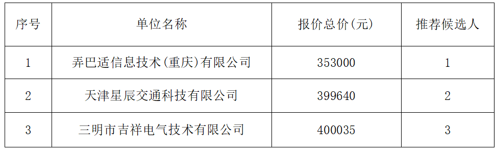 本次2025-2026年三明高速公路称重设备加固项目,采用 询价 采购方式,于2025年8月22日在福建省高速公路集团门户网站(/)、中国采购与招标网(http://www.chinabidding.com.cn/)、福建省高速公路集团集中采购平台(https://gsjc.fjetc.com/index)上发布询价公告,截止至2025年8月27日10点00分,共收到三明市吉祥电气技术有限公司、弄巴适信息技术(重庆)有限公司、天津星辰交通科技有限公司、安徽路影康途科技有限公司、福州青拓智能科技有限公司等5家公司报价函。评审结果详见下表:
