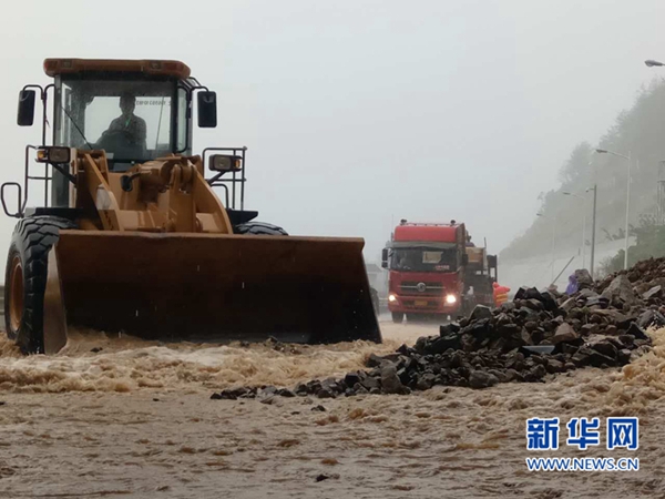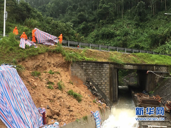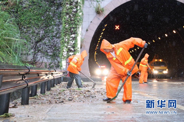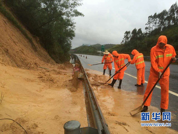 养护人员在福州绕城高速对路面及边坡险情进行抢险