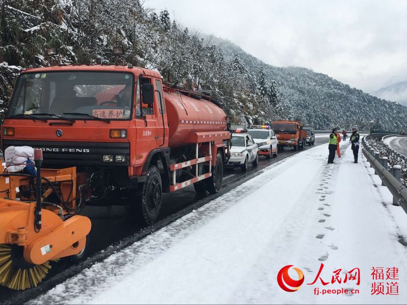 福建高速公路部门立即投入人员装备进行除冰作业,目前相关路段正在交通管制之中。据了解,福建省高速公路公司已准备应急队伍34支1291人,作业车117辆,发电机19台,部署融雪剂126吨、撒盐机22台,工业盐203吨,编织袋42890个,洋镐128把、铁铲449把、除冰铲147把、锄头348把。在各个服务区还储备了至少5天能供300人以上食用的米、面、水等基本物资;另外,个别地势较高的服务区,还储备了棉被(毛毯)、感冒药等物品,保障滞留旅客需要;加油站也储备充足的油量,保障过往车辆的加油需求。