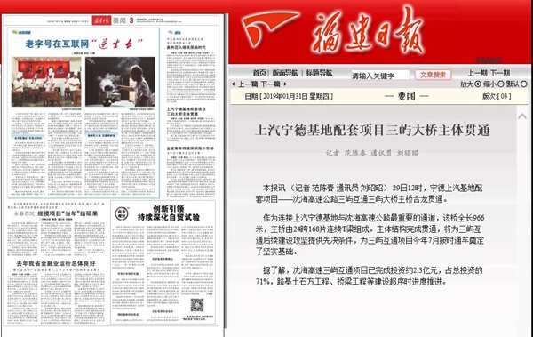 1月29日12时,宁德上汽基地配套项目——沈海高速公路三屿互通三屿大桥主桥合龙贯通。