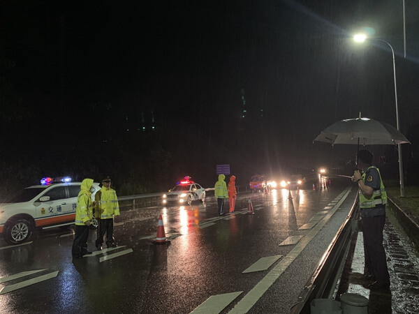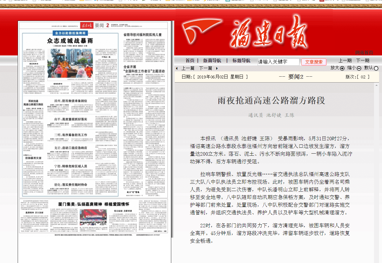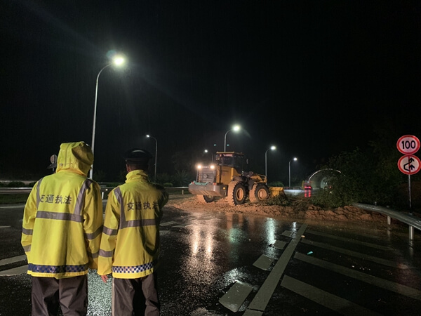 拉响车辆警报、放置反光锥……省交通执法总队福州高速公路支队三大队八中队执法员立即布控现场。此时,被困车辆内仍坐着两名司乘人员,为避免受到二次伤害,中队长潘明山立即上前解释,并将两人转移至安全地带。八中队随即启动汛期应急保畅方案,及时通知交警、养护等部门前来处置。处置现场,八中队积极配合交警部门对道路实施交通管制,并组织交通执法员、养护人员以及清障、铲车等大型机械清理溜方。