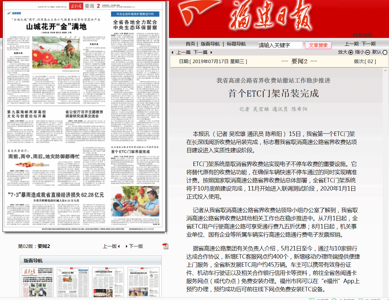 福建日报:我省高速公路省界收费站撤站工作稳步推进 首个ETC门架吊装完成