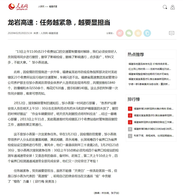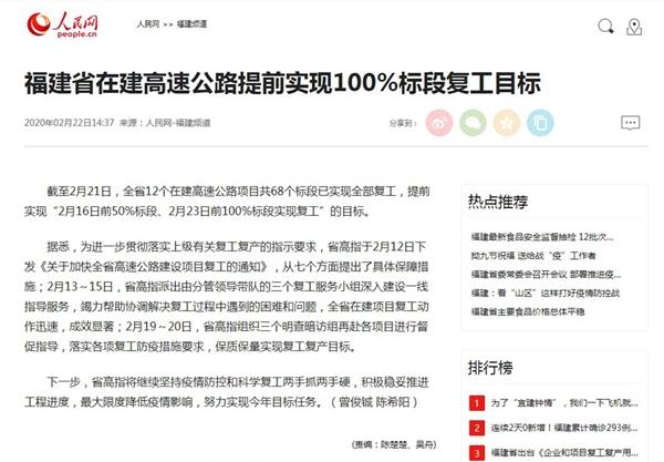 多家媒体报道我省高速公路防疫、复工及保畅通等工作 文章来源: 发布时间: 2020-02-27 10:31 星期四 阅读次数: 3328多家媒体报道我省高速公路防疫、复工及保畅通等工作:福建卫视新闻|福建:在建高速公路实现100%标段复工人民网|福建省在建高速公路提前实现100%标段复工目标人民网|龙岩高速:任务越紧急,越要显担当 上一篇: 人在哪里,责任就在哪里——一位外出党员领导干部在家乡“即时”抗疫记下一篇: 多家媒体报道我省高速公路防疫、复工及保畅通等工作