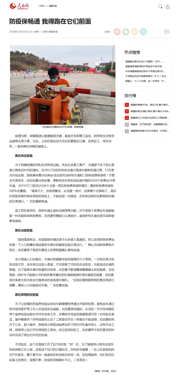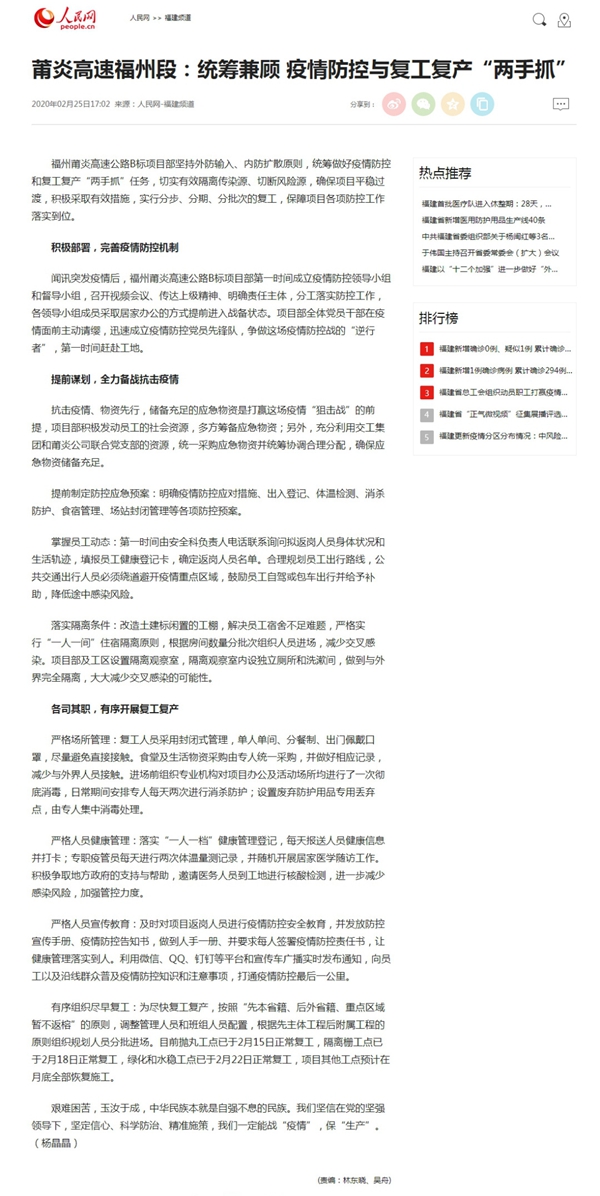 人民网|莆炎高速福州段:统筹兼顾 疫情防控与复工复产“两手抓”