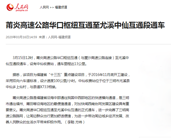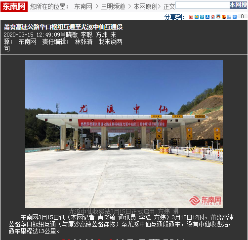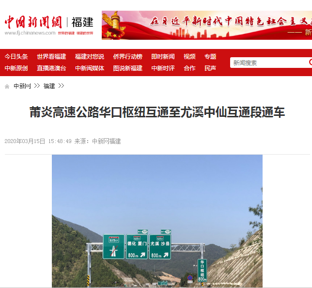 多家媒体报道莆炎高速公路华口枢纽互通至尤溪中仙互通段通车