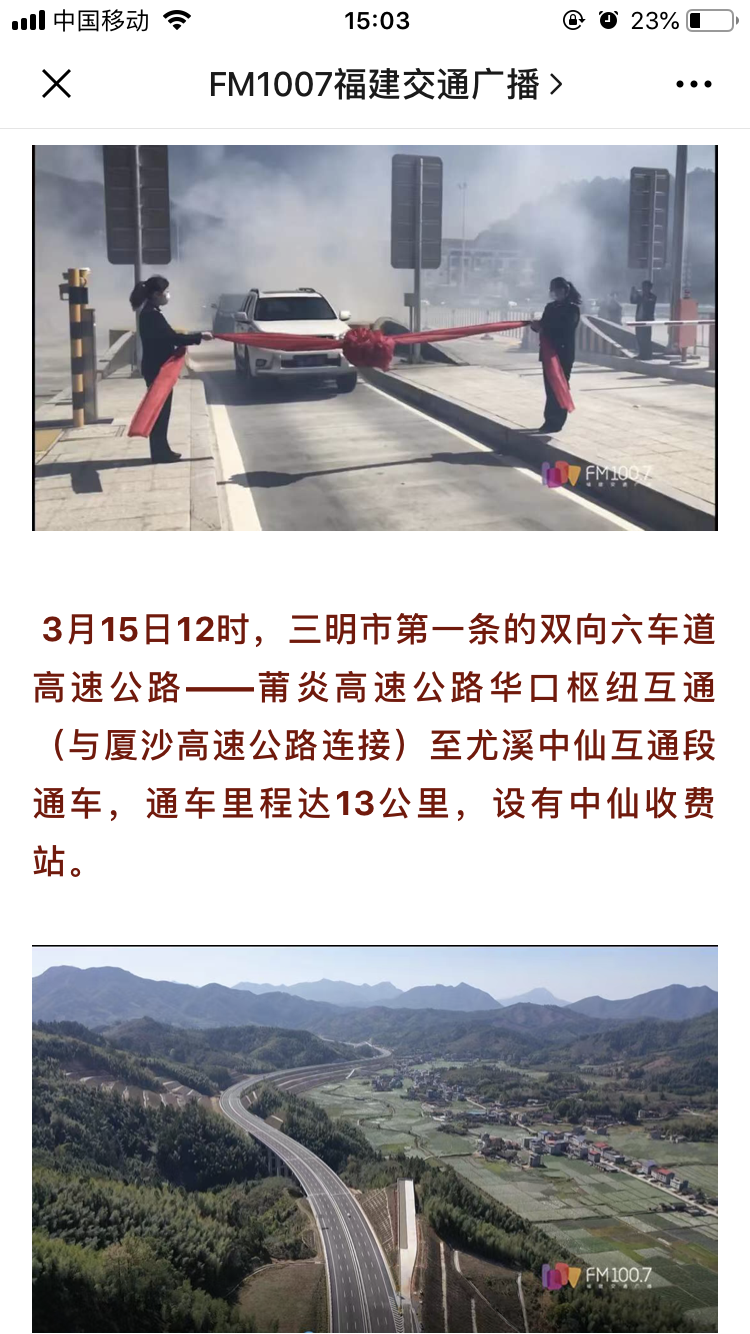 15日,莆炎高速公路中仙收费站至华口枢纽互通路段正式通车。此路段的通车,进一步完善了三明高速公路路网,使尤溪县中仙乡至尤溪县城行车时间节省近一个小时,通往福州、厦门等地更加便利。(摘自福建日报)