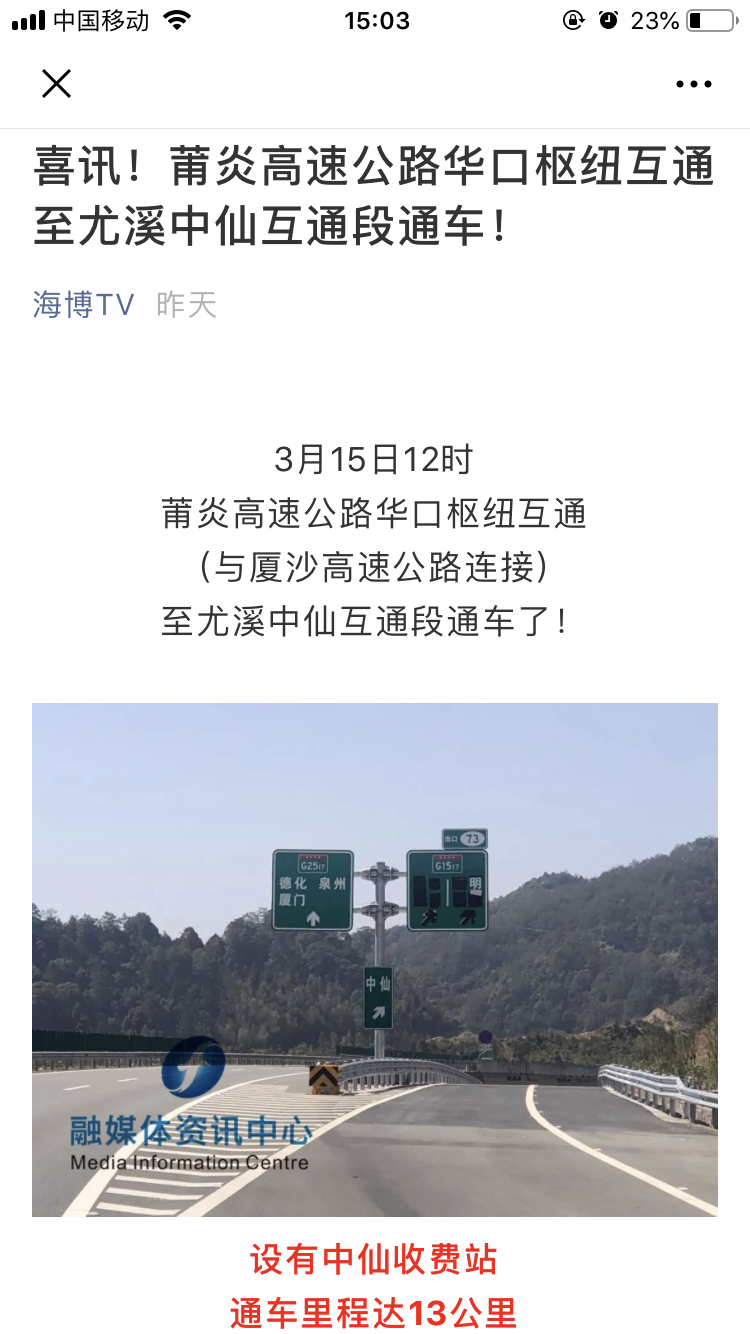 3月15日12时,莆炎高速公路华口枢纽互通(与厦沙高速公路连接)至尤溪中仙互通段通车,设有中仙收费站,通车里程达13公里。