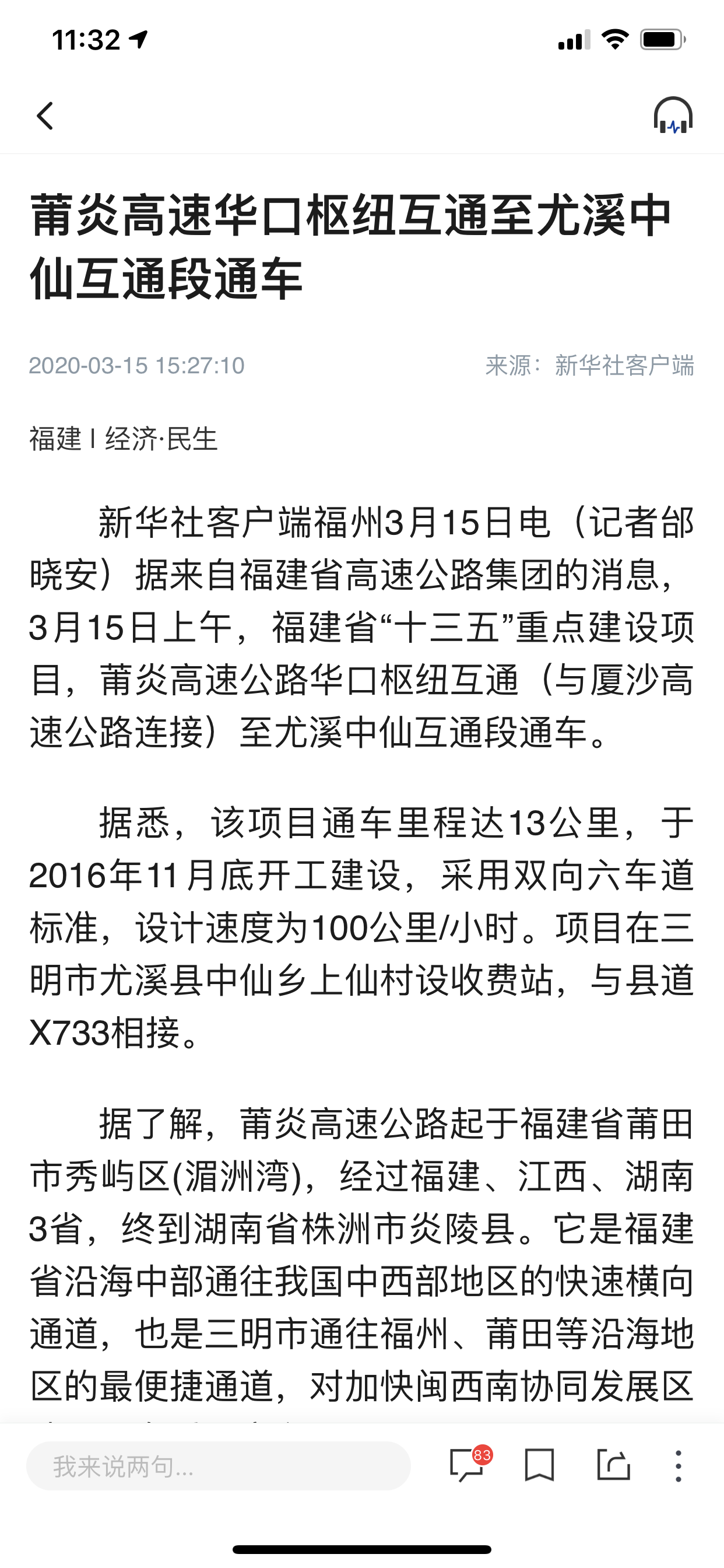 莆炎高速华口枢纽互通至尤溪中仙互通的正式通车,进一步完善了三明高速公路路网,为进一步带动周边城乡经济发展、改善人民群众的生活水平带来积极作用。(摘自新华社)