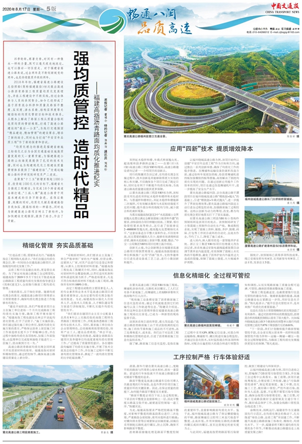 在聚焦“十三五”新增里程超1000公里、投资超1000亿元的目标下,福建省大力推进工程建设,为完成18个跨省通道全部打通、“三纵八横”高速公路骨干网基本建成的任务不断奋进。在保证数量、规模的同时,均质化无疑是福建高指自我加压、提高标准的一种姿态,同时也为新建高速公路项目树立了新标杆,为加快建设交通强国,提供了助力,作出了贡献。