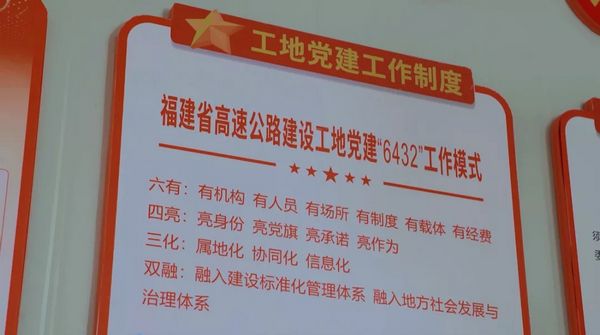 2017年以来,福建省高速公路建设总指挥部探索出“6432”工地党建工作模式,形成了由行业主导、业主主抓、标段主责的党建工作格局,从而实现了“支部建在工地上,党旗飘扬在岗位上”。