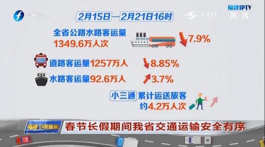 [东南卫视] 春节长假期间我省交通运输安全有序 文章来源: 发布时间: 2018-02-23 10:02 星期五 阅读次数: 6574春节长假期间我省交通运输安全有序: 点击以上图片观看 上一篇: [东南卫视] 福建:迎来返程高峰 交通部门多举措保畅通下一篇: [东南卫视] 旅客病情发作 高速部门紧急救援